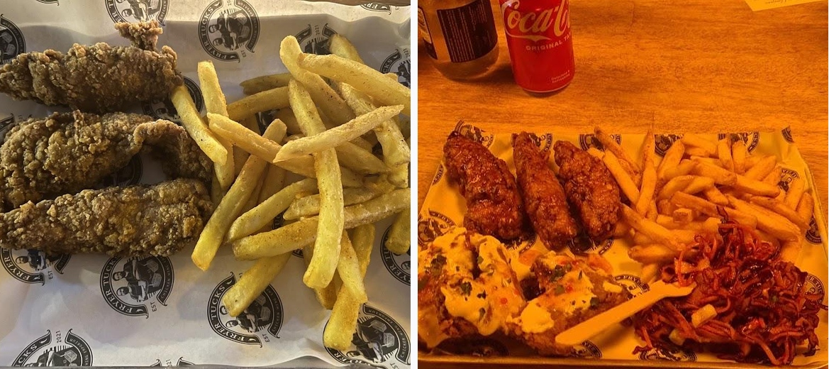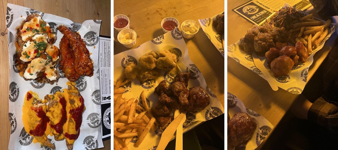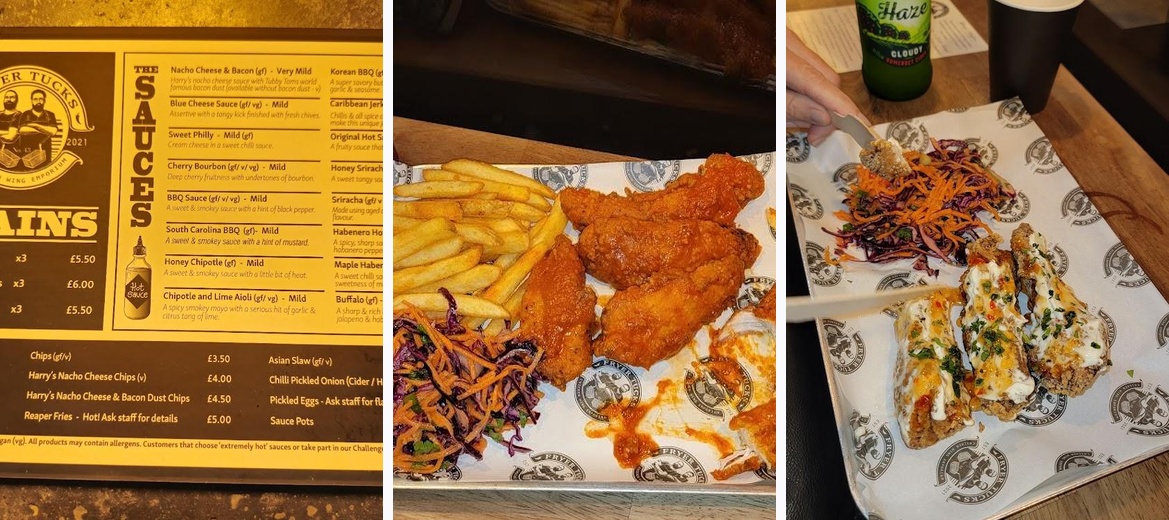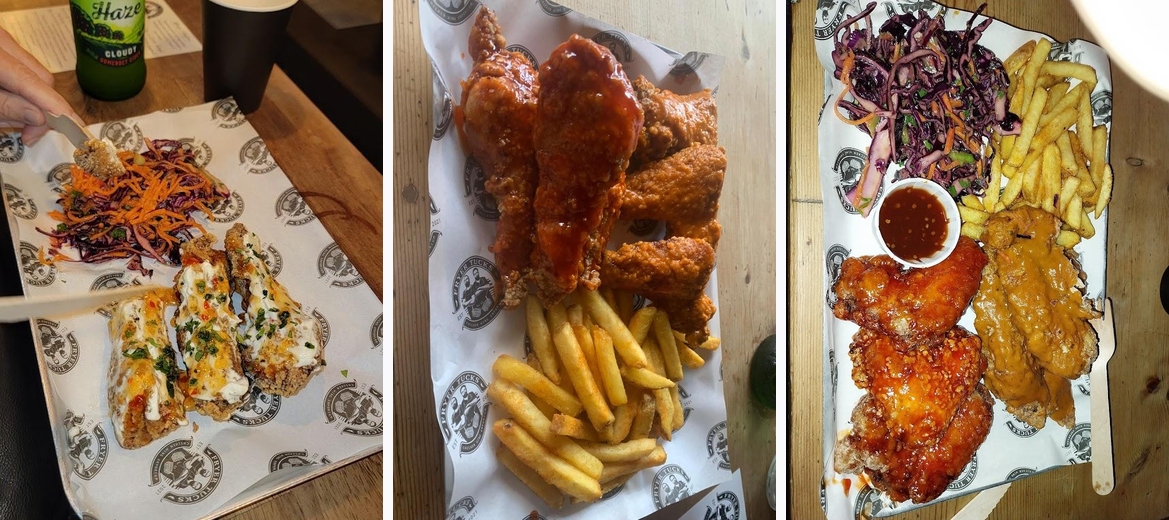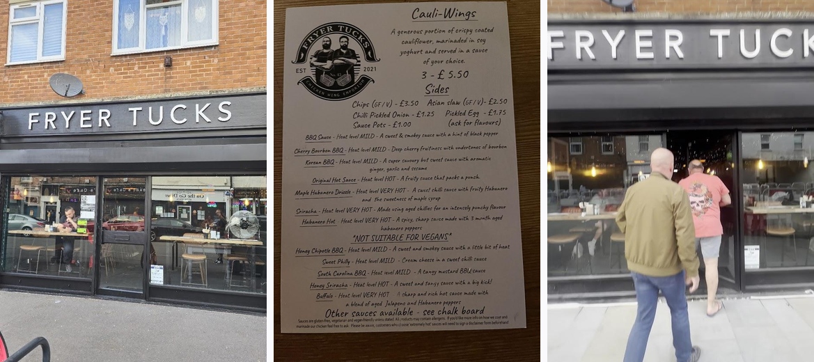 Fryer Tucks specializes in a range of fried chicken options, including substantial chicken wings and goujons. They also offer unique dishes like cauli-wings.